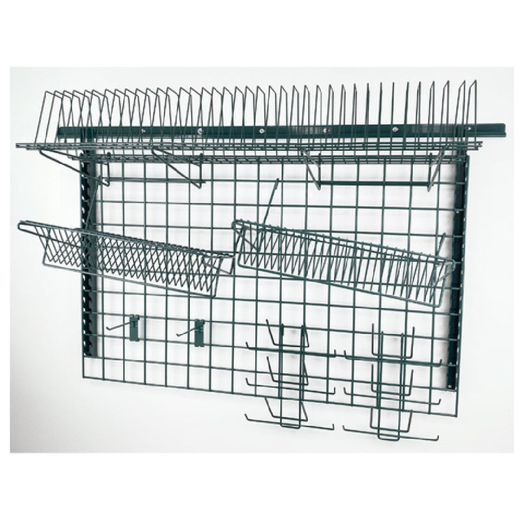 The Quantum SGK-563048-1P Store Grid Medium-Duty Kit is a versatile solution designed for efficient organization and storage. It features a 56-inch wall track - a sturdy foundation that supports various components for optimal space utilization. Complementing the wall track are two 31-inch uprights, providing structural integrity and enhancing the kit's adaptability to different storage needs. Central to this system is the 48-inch wide by 30-inch high grid panel, offering ample space for arranging and securing items. This kit includes a 46-inch wide by 14-inch deep tray drying rack, ideal for efficiently drying and organizing trays. Additional functionality is provided by two slanted tray drying racks, enhancing drying capacity and organization. For specialized storage, the kit includes two bottle holders, securing bottles firmly, and two 6-inch hooks, offering flexible hanging options for various items. The entire assembly is finished with a green epoxy antimicrobial coating, ensuring durability and safety by resisting microbial growth. Certified by NSF, this kit meets stringent health and safety standards, making it suitable for diverse applications across industries requiring reliable and hygienic storage solutions. Its thoughtful design and robust features make it an essential asset for maintaining organization and cleanliness in professional environments.