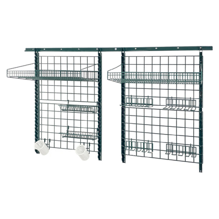 The Quantum SGK-721830-1P Store Grid Medium-Duty Kit is a versatile storage solution designed for various industries requiring efficient organizational systems. This kit includes a 72-inch wall track, essential for stable mounting and supporting the entire setup. It features four 44-inch uprights, providing a robust framework for the entire grid system. Additionally, this kit includes four grid panels, each measuring 30 inches in width and 18 inches in height, allowing for flexible storage configurations. The inclusion of two large shelves, each 30 inches wide and 18 inches deep, enhances the kit's storage capacity. Designed for specific storage needs, the kit comes with two lid holder drying racks and two cylinder holders, ensuring organized storage for specific items. Furthermore, it includes two flatware cylinders and utensil holders, with two at 4 inches wide and two at 10 inches wide, catering to diverse storage requirements. The entire system is coated with a green epoxy antimicrobial finish, providing an additional layer of protection and ensuring compliance with hygiene standards. The Quantum SGK-721830-1P is NSF certified, making it suitable for environments demanding high sanitary standards, such as food service operations and medical facilities, underlining its utility across various sectors.
