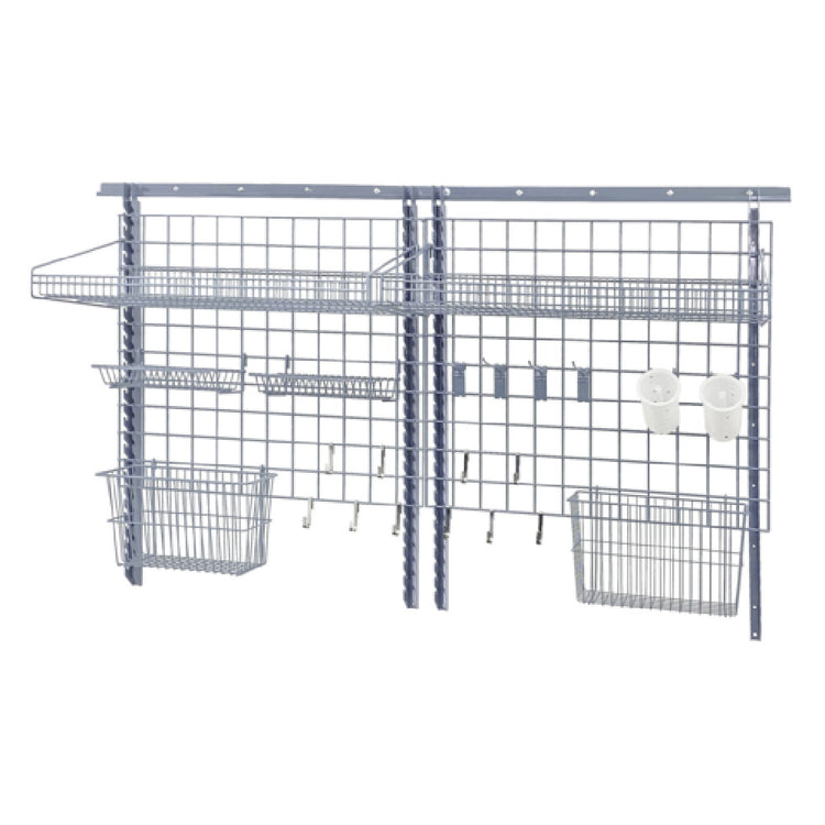 The Quantum SGK-723036-1GY Store Grid Medium-Duty Kit is a meticulously designed storage solution, tailored for diverse industry applications requiring organized and efficient space management. This comprehensive kit includes a single 72-inch wall track, providing a sturdy foundation for storage needs. Complementing the wall track are four 44-inch uprights and two grid panels measuring 36 inches in width by 30 inches in height, offering ample structural support and versatility. For expansive storage capacity, the kit includes two large shelves, each measuring 30 inches in width and 18 inches in depth, along with two lid holder drying racks for additional utility. The kit also encompasses two cylinder holders and two flatware cylinders, enhancing its capacity to accommodate various storage items. To further optimize space utilization, the kit provides two baskets with dimensions of 17 inches in width, 7 inches in depth, and 10 inches in height. Additionally, it features an assortment of hooks, including four 6-inch hooks and ten small hooks, facilitating diverse hanging options. Coated in a gray epoxy antimicrobial finish, this kit is designed to meet NSF standards, ensuring compliance with rigorous health and safety requirements. The Quantum SGK-723036-1GY kit is an ideal choice for sectors necessitating reliable, hygienic, and adaptable storage systems.