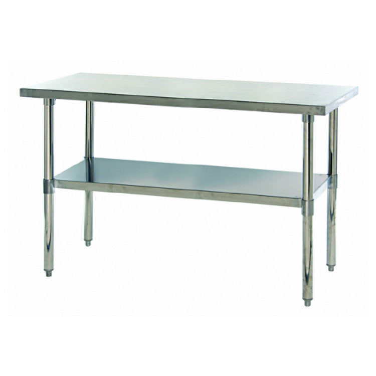 The Quantum SST-2460U Work Table is a highly functional and versatile piece of equipment designed to meet the rigorous demands of various industries. Measuring 60 inches in width, 24 inches in depth, and 34 inches in height, this work table provides ample space for diverse applications, from commercial kitchens to industrial workshops. Constructed from 304 stainless steel, it offers exceptional durability and resistance to corrosion, making it suitable for environments where hygiene and longevity are paramount. The table features hemmed edges, enhancing safety by minimizing sharp edges. An adjustable undershelf allows for customizable storage solutions, catering to specific organizational needs. Additionally, the adjustable feet ensure stable placement on uneven surfaces, contributing to a reliable and steady workspace. The Quantum SST-2460U Work Table is shipped in a knocked-down (KD) form, facilitating easier transport and assembly in tight spaces. This robust work table is an ideal choice for professionals seeking a reliable and adaptable workspace solution, combining practical design elements with high-quality materials to support a wide range of tasks across different market segments, including food service, healthcare, and manufacturing industries. Its thoughtful construction and adaptability make it a valuable asset in any professional setting.