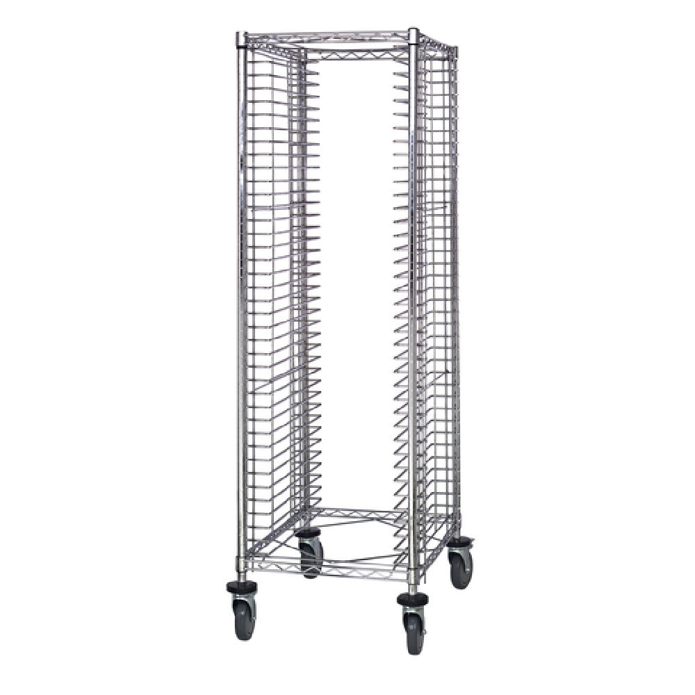 The Quantum TC-EL38 Tray Cart Mobile Full Size is a versatile storage solution designed for various industries that require efficient and organized tray storage. Featuring dimensions of 27"W x 21-3/4"D x 69"H, this full-size cart is optimized for end loading, allowing it to accommodate up to 38 trays. This capacity makes it ideal for environments such as commercial kitchens, bakeries, and healthcare facilities where large quantities of items need to be transported or stored systematically. The cart's construction includes a chrome-plated finish, which not only provides a sleek and polished appearance but also ensures durability and resistance to corrosion over time. The inclusion of casters facilitates smooth mobility, enabling easy maneuverability across different sections of a facility. Additionally, the Quantum TC-EL38 is NSF certified, which guarantees that it meets strict standards for public health protection, making it a reliable choice for settings that prioritize hygiene and safety. Whether used in a bustling catering operation or a hospital setting, this tray cart offers a combination of practicality and quality, meeting the diverse needs of professional spaces that require robust and adaptable storage solutions.