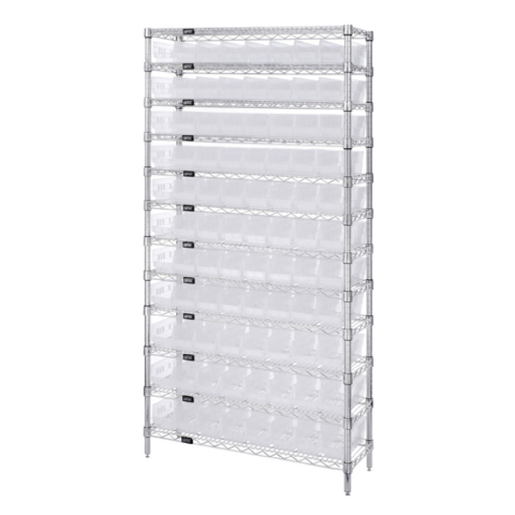 The Quantum WR12-101CL Bin Wire Shelving System is a precision-engineered storage solution, delivering robust functionality with its 36"W x 12"D x 74"H overall dimensions. The system boasts a remarkable weight capacity of 800 lb per shelf, ensuring it meets the demanding storage needs of various professional environments. Included within this system are 12 wire shelves, providing ample storage space for organized accessibility. Its structure is supported by four sturdy posts, ensuring stability and durability. The addition of 88 QSB101 clear bins enhances the system's utility, offering visibility and organization for stored items. The chrome-plated finish not only adds a sleek appearance but also contributes to its durability by resisting corrosion and wear, making it suitable for long-term use in diverse environments. Whether utilized in industrial settings, commercial warehouses, or retail operations, this shelving system offers a valuable combination of strength, efficiency, and organization, tailored to meet the specific needs of various industry segments. Its thoughtful design and practical features make the Quantum WR12-101CL Bin Wire Shelving System a versatile and reliable choice for enhancing storage efficiency and providing an organized solution for any storage requirement.