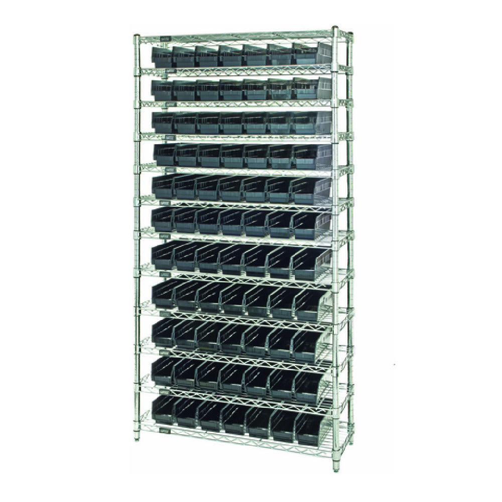 The Quantum WR12-103CO Bin Wire Shelving System Conductive 36"W X 18"D X 74"H Overall Size is a versatile shelving solution designed for various industry needs, offering both functionality and organization. This conductive wire shelving system boasts a substantial 800 lb. capacity per shelf, making it suitable for heavy-duty storage requirements. The system includes twelve wire shelves and four sturdy posts, ensuring robust and reliable support for your stored items. Additionally, with 88 QSB103 bins provided, it facilitates efficient sorting and storage, making it ideal for environments that demand meticulous organization. The chrome-plated finish not only enhances its durability but also adds a sleek, professional look, suitable for diverse settings such as warehouses, workshops, and retail environments. Available in multiple colors, this shelving system can be customized to fit the aesthetic preferences of different spaces. Its conductive nature makes it particularly useful for industries where static discharge is a concern, providing a safe storage option for sensitive electronic components. With precise dimensions of 36" in width, 18" in depth, and 74" in height, the Quantum WR12-103CO Bin Wire Shelving System is a practical choice for optimizing storage space while maintaining accessibility and organization of materials.