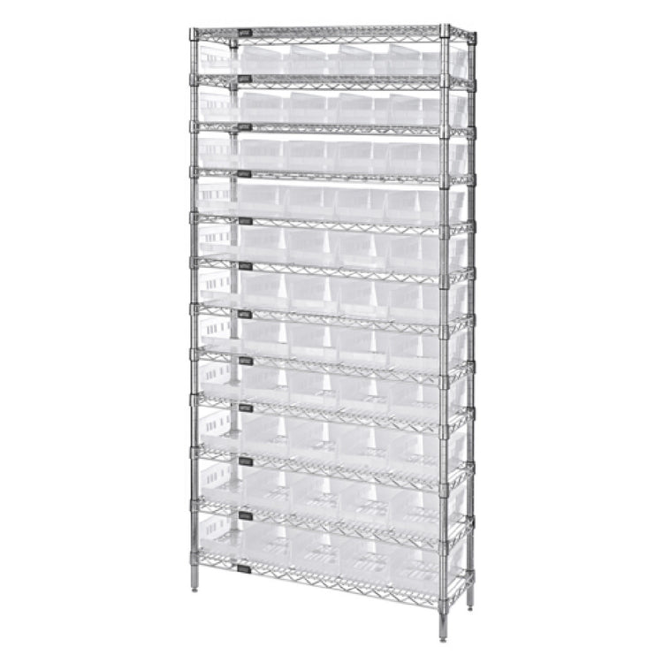 The Quantum WR12-104CL Bin Wire Shelving System, with an overall size of 36"W x 18"D x 74"H, is a versatile and robust storage solution ideal for a variety of industries. Its design includes 12 wire shelves and 4 sturdy posts, each shelf boasting an impressive 800 lb. capacity, making it suitable for heavy-duty storage needs. The system also incorporates 55 QSB104 clear bins, providing ample organization and visibility for stored items. Featuring a chrome-plated finish, this shelving system not only ensures durability and stability but also offers a sleek aesthetic suitable for professional environments. This product's unique value proposition lies in its combination of high weight capacity and organizational efficiency, making it a valuable asset for industries ranging from retail to warehouses and manufacturing facilities. Its modular design caters to diverse storage requirements, while the clear bins facilitate easy identification and access, enhancing operational productivity. The Quantum WR12-104CL Bin Wire Shelving System is engineered for reliability and efficiency, addressing the storage challenges faced by different market segments within the commercial and industrial sectors.