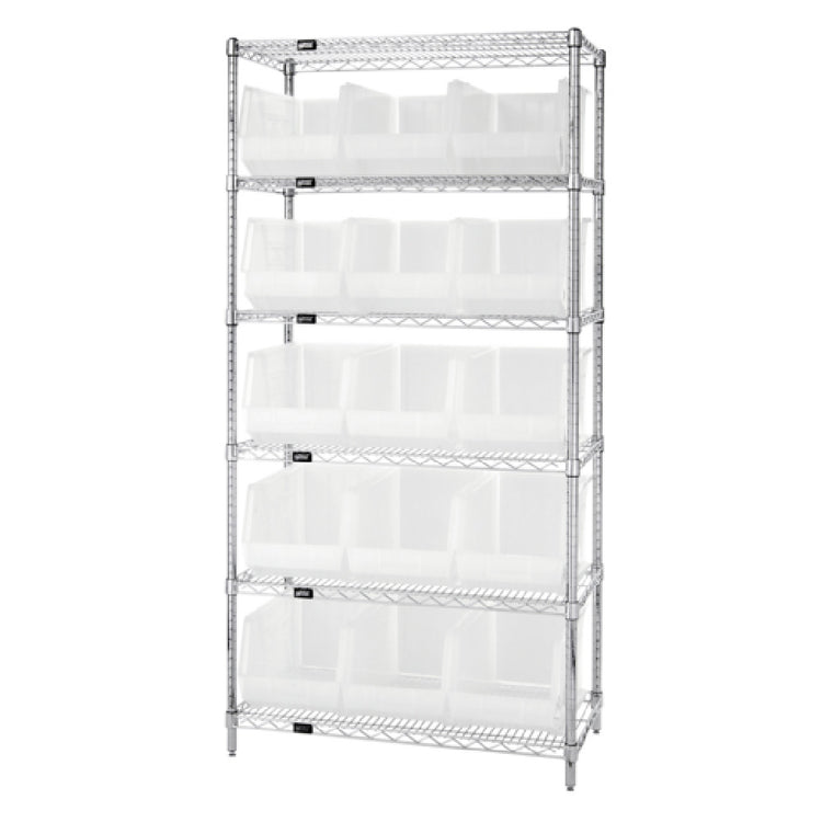 The Quantum WR6-260CL Bin Wire Shelving System 36"L x 18"D x 74"H 800 Lbs. Load Capacity Per Shelf is a robust storage solution, designed to meet the demands of diverse industries. Featuring six shelves and fifteen QUS260 clear containers, this system provides substantial organizational capabilities for environments ranging from warehouses to retail settings. Each shelf boasts an impressive load capacity of 800 lbs., ensuring that heavy items can be stored with ease and safety. The chrome plated finish not only enhances the aesthetic appeal but also offers durability and corrosion resistance, extending the lifespan of the shelving system. Shipped KD (knocked down), it facilitates easy transportation and assembly, making it convenient for businesses seeking efficient setup and relocation. The clear containers allow for quick visual identification of contents, streamlining inventory management and accessibility. This shelving system is particularly suited to industries requiring rigorous storage solutions, such as supply chain operations, manufacturing plants, and large-scale retail outlets. By combining high load capacity with efficient design, the Quantum WR6-260CL Bin Wire Shelving System is an ideal choice for maximizing storage efficiency and organization in demanding operational environments.