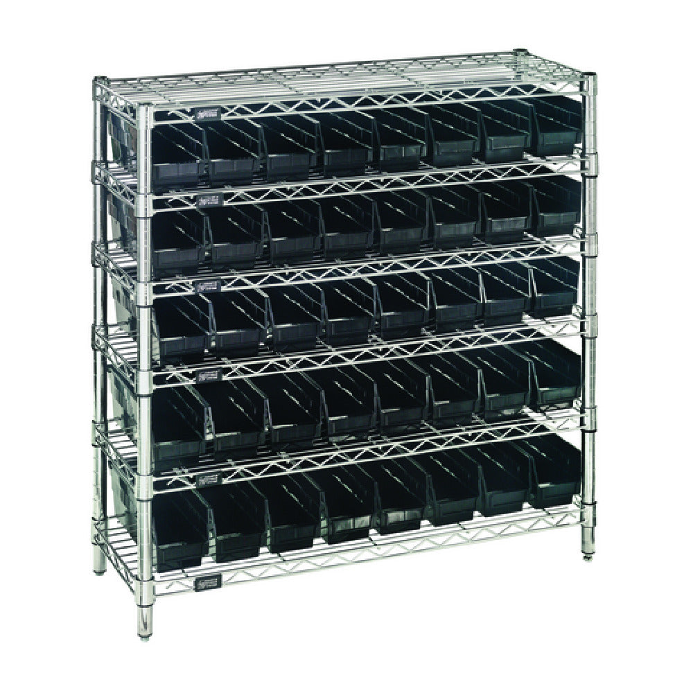 The Quantum WR6-36-1236-101CO Bin Wire Shelving System Conductive 36"W X 12"D X 36"H Overall Size is engineered for efficiency and durability in various industrial settings. This shelving system features a robust construction with an 800 lb. capacity per shelf, catering to heavy-duty storage needs. It includes six wire shelves and four posts, ensuring stability and versatility in organizing materials. The unit's conductive properties are particularly beneficial for environments where static electricity management is crucial, enhancing safety and compliance with industry standards. The system's overall dimensions of 36 inches in width, 12 inches in depth, and 36 inches in height make it a compact yet spacious solution for maximizing storage space. Included in this system are forty QSB101 bins, providing ample organizational options. The chrome-plated finish not only adds to the aesthetic appeal but also offers protection against corrosion, extending the product's lifespan even in challenging environments. The Quantum WR6-36-1236-101CO bin wire shelving system is an optimal choice for sectors such as electronics manufacturing, warehousing, and other industries requiring conductive storage solutions, underscoring its value in maintaining efficient, organized, and safe operational workflows.