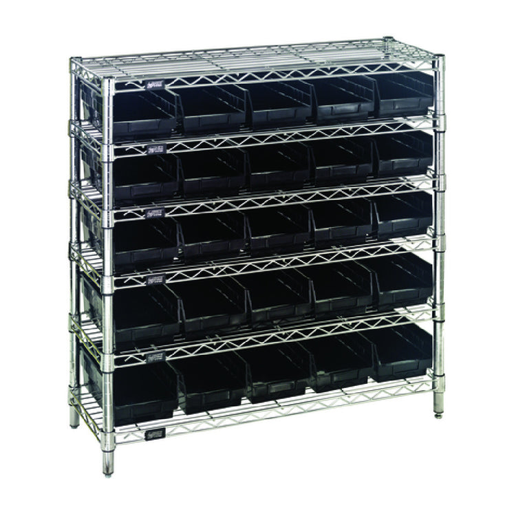 The Quantum WR6-36-1236-102CO Bin Wire Shelving System is a robust storage solution, optimized for industries requiring reliable and conductive storage capabilities. With an overall size of 36"W x 12"D x 36"H, this system is not only compact but also highly efficient in space utilization. Each of the six wire shelves boasts an impressive 800 lb. capacity, catering to diverse storage needs across various sectors. The system is equipped with four sturdy posts providing a stable framework and a chrome-plated finish that adds durability and aesthetic appeal. It includes 25 QSB102 clear bins, facilitating easy identification and access to stored items. This feature is particularly beneficial in environments where inventory management and quick retrieval of components are critical. The conductive nature of the shelving system ensures that static-sensitive items are stored safely, making it an indispensable asset in electronics manufacturing, laboratories, and other settings where static discharge could be detrimental. The Quantum WR6-36-1236-102CO exemplifies a perfect blend of strength, reliability, and functionality, tailored to meet the precision and safety standards demanded by professionals in a variety of technical and industrial fields.