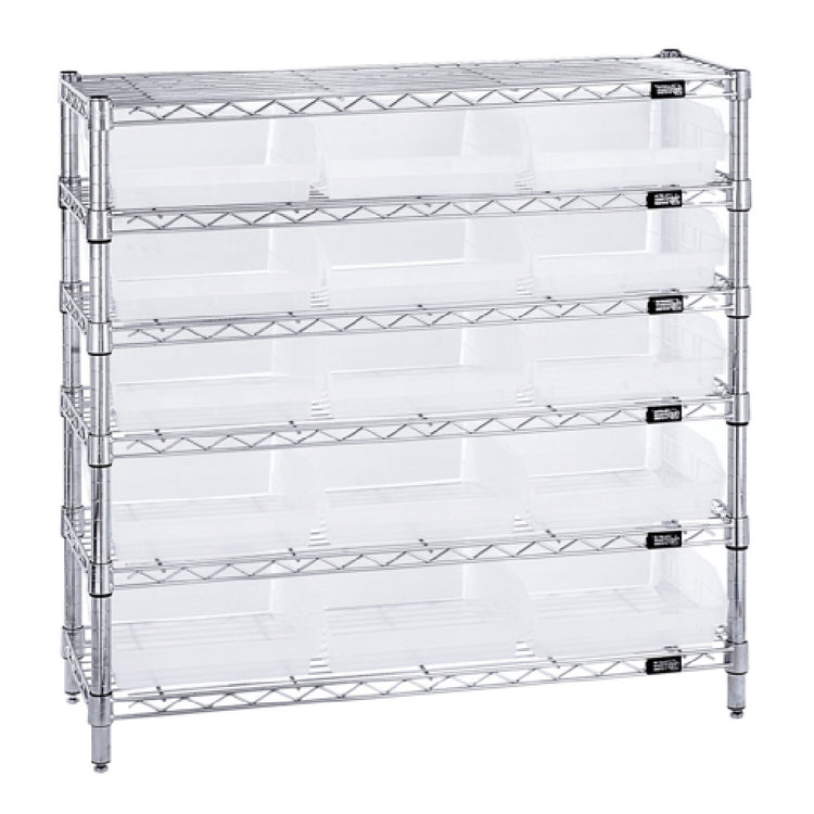 The Quantum WR6-36-1236-109CL Bin Wire Shelving System is a meticulously designed storage solution engineered for various industrial and commercial applications. With an overall size of 36"W x 12"D x 36"H, this shelving system is compact yet highly efficient, featuring a robust capacity of 800 lb. per shelf. The system comprises six durable wire shelves, supported by four sturdy posts, providing ample storage space for a variety of items. It includes fifteen QSB109 clear bins, which are ideal for organizing small parts or inventory, enhancing visibility and accessibility. The chrome-plated finish not only adds an aesthetic appeal but also ensures lasting durability and resistance to corrosion. This system is especially valuable for environments that require a high degree of organization and efficiency, such as warehouses, workshops, and retail spaces. The combination of clear bins and wire shelving offers a versatile, easy-to-clean solution that supports a streamlined workflow, making it a practical choice for businesses aiming to maximize storage capability while maintaining a tidy and professional space. Its thoughtful design caters to the diverse needs of different market segments, emphasizing functionality and reliability.