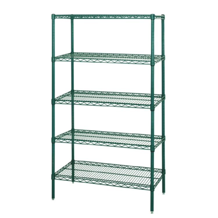 The Quantum WR63-1242P-5 Wire Shelving Starter Kit is an expertly engineered storage solution, measuring 42"W x 12"D x 63"H, and offering a robust weight capacity of 600 - 800 lb. This kit includes five wire shelves and four posts, providing a sturdy framework catered to diverse storage needs. Finished in a green epoxy antimicrobial coating, it ensures a hygienic surface, making it well-suited for environments requiring stringent cleanliness standards. This shelving unit complies with NSF certification, indicating its alignment with public health and safety standards, making it appropriate for use in various sectors including healthcare, food service, and industrial applications where hygiene and reliability are paramount. The kit is shipped knocked down (KD), facilitating easy assembly and transportation. Its wire design allows for excellent air circulation and visibility of stored items, enhancing its utility in keeping goods organized and easily accessible. The Quantum WR63-1242P-5 is designed to meet the demands of both commercial and residential settings, offering a versatile and dependable storage solution that adapts seamlessly to different industry requirements.