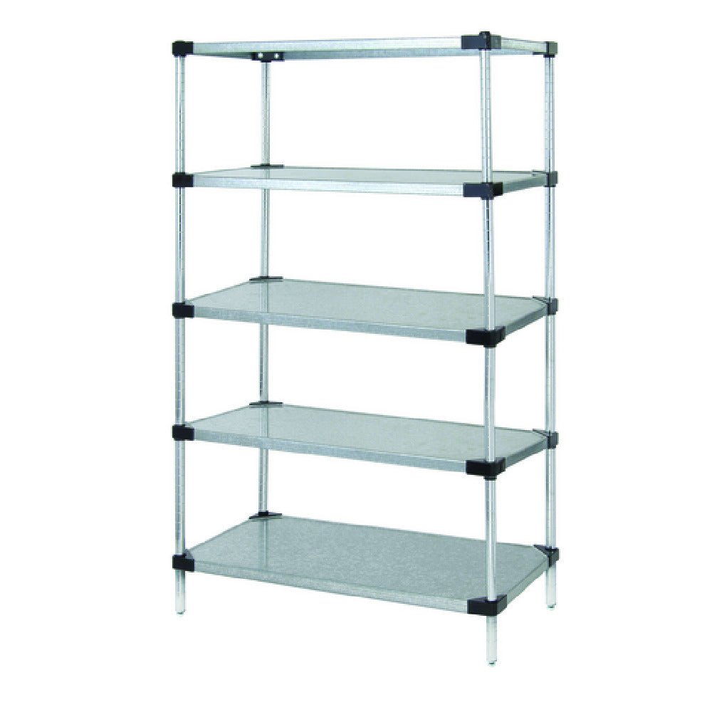 The Quantum WR63-2142SG-5 Solid Shelving Starter Kit is a meticulously designed storage solution featuring dimensions of 42 inches in width, 21 inches in depth, and 63 inches in height. This kit includes five solid galvanized steel shelves and four chrome-finished posts, ensuring both durability and a sleek appearance. The galvanized steel construction provides exceptional resistance to corrosion, making it suitable for environments where hygiene and cleanliness are paramount. With its NSF certification, this shelving kit meets industry standards for public health protection, which is crucial for sectors such as food service, healthcare, and laboratory settings. Shipped in a knocked-down form, the Quantum WR63-2142SG-5 offers convenience in transportation and assembly. Its solid shelves provide a stable platform for storing various items, accommodating different storage needs across diverse industries. Whether in a commercial kitchen needing reliable shelving for heavy cookware, a pharmaceutical facility requiring sterile storage, or a retail space seeking organized display solutions, this shelving kit proves versatile. The thoughtful combination of solid shelves and robust posts ensures that the Quantum WR63-2142SG-5 not only meets but exceeds the expectations of professionals seeking quality and practicality in their storage systems.
