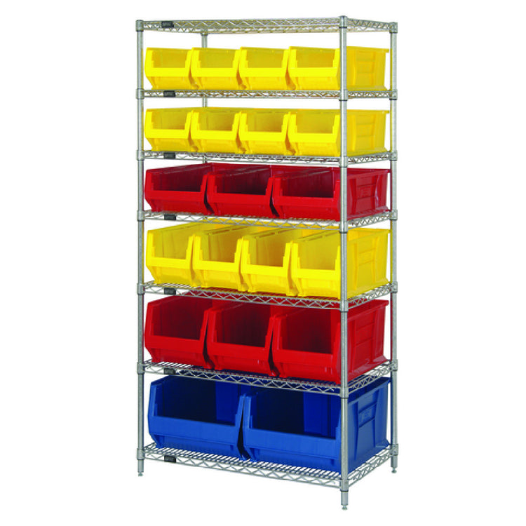 The Quantum WR7-20-MIX Bin Wire Shelving System is a versatile storage solution, measuring 36 inches in width, 24 inches in depth, and 74 inches in height, engineered to support up to 800 pounds per shelf. This system includes seven wire shelves and four posts, providing a robust framework for a variety of storage needs. It features a comprehensive assortment of storage bins - eight QUS950 bins, three QUS952 bins, four QUS951 bins, three QUS953 bins, and two QUS954 bins - available in multiple colors, allowing for efficient organization and accessibility of stored items. The chrome-plated finish not only enhances durability but also adds a sleek, professional appearance suited for industrial and commercial settings. This shelving system is ideal for environments where space optimization and weight capacity are paramount, such as warehouses, workshops, and retail spaces. Its modular design offers flexibility for numerous configurations, catering to the unique demands of different market segments in industries ranging from manufacturing to logistics. The Quantum WR7-20-MIX Bin Wire Shelving System is constructed to deliver both strength and adaptability, ensuring it meets the rigorous requirements of its users while maintaining an orderly and accessible storage environment.