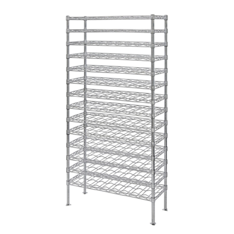 The Quantum WR74-1448WSC Wine Cradle Shelving Unit is a precisely engineered storage solution designed to meet the needs of wine connoisseurs and commercial establishments alike. Measuring 48 inches in width, 14 inches in depth, and 74 inches in height, this unit efficiently utilizes space while providing a significant capacity, holding up to 168 bottles. The unit features 14 cradle shelves, meticulously spaced to ensure each bottle is securely cradled, minimizing the risk of damage. Supported by four sturdy posts, the unit's stability is further enhanced with included foot plates and wall brackets, offering additional security and peace of mind. The shelving unit is finished with a chrome plating, not only providing an elegant appearance but also ensuring durability and resistance to corrosion. Ideal for use in restaurants, wine bars, or home cellars, the Quantum WR74-1448WSC offers an optimal combination of functionality and style. Its design caters to various market segments within the wine storage industry, from personal collectors to professional curators, delivering both aesthetic appeal and robust functionality that promises to preserve and showcase your collection effectively.