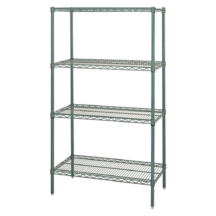 The Quantum WR74-1836P Wire Shelving Starter Kit is a versatile storage solution designed for a variety of industrial needs, with dimensions measuring 36"W x 18"D x 74"H. This sturdy unit boasts a weight capacity ranging from 600 to 800 pounds, accommodating heavy items with ease. Included in this kit are four wire shelves and four posts, providing a reliable framework for efficient storage organization. The shelves feature a green epoxy antimicrobial finish, enhancing their durability and resistance to microbial growth, making them suitable for environments that demand high levels of hygiene. This feature is particularly beneficial in healthcare, food service, and laboratory settings where cleanliness is paramount. The Quantum WR74-1836P is NSF certified, ensuring compliance with public health and safety standards, and it is shipped in a knocked-down (KD) format for convenient transportation and assembly. Its robust construction and thoughtful design make it a practical choice for warehousing, retail, and commercial applications, where maximizing storage space while maintaining a clean and organized environment is essential. With its combination of strength, safety, and flexibility, the Quantum WR74-1836P Wire Shelving Starter Kit exemplifies quality and reliability in wire shelving systems.