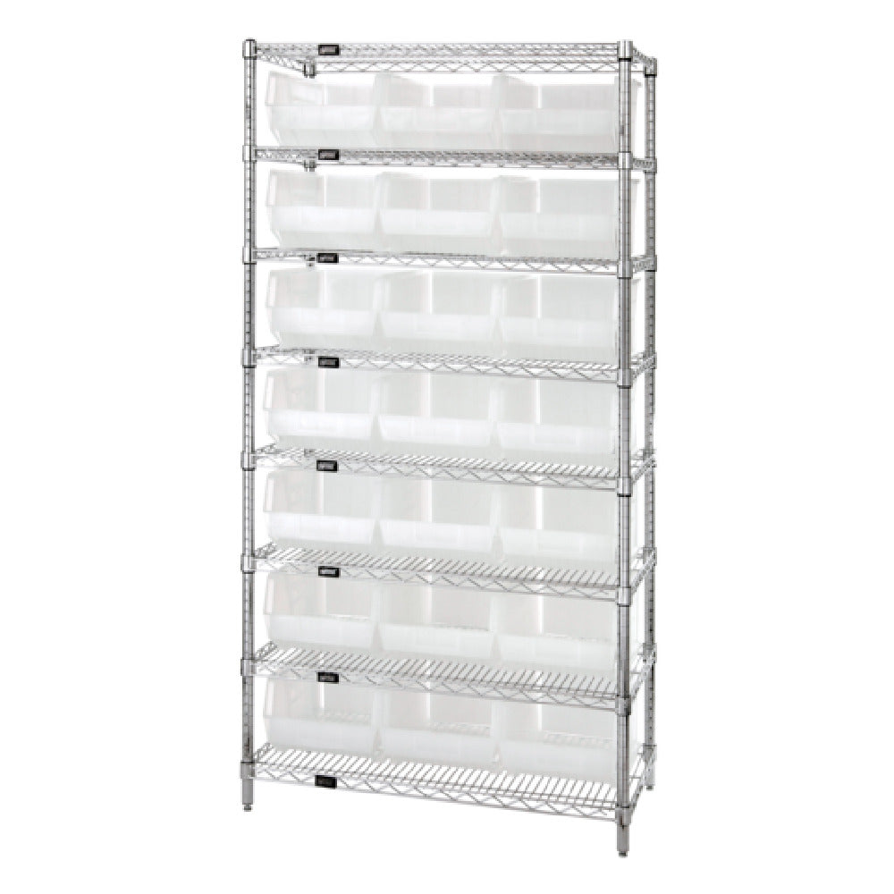 The Quantum WR8-255CL Bin Wire Shelving System is a robust and versatile storage solution, measuring 36 inches in width, 18 inches in depth, and 74 inches in height. Each shelf boasts an impressive 800 lbs. load capacity, making it suitable for a wide range of heavy-duty applications. The system includes eight chrome-plated shelves that are both durable and aesthetically pleasing. Accompanying these shelves are 21 QUS255 clear bins, providing ample storage and organization options for various items. The chrome-plated finish not only enhances the system's visual appeal but also contributes to its longevity by providing resistance to corrosion. Shipped KD (knocked down), the system is designed for easy assembly upon delivery. This shelving system is particularly valuable for industries that require organized storage of tools, components, or supplies, such as manufacturing, warehousing, and retail. The clear bins enable quick identification and access to stored items, enhancing operational efficiency. The Quantum WR8-255CL's blend of substantial load-bearing capacity, customizable storage options, and durable construction makes it an ideal choice for businesses seeking a reliable and adaptable shelving solution to meet their diverse storage needs.