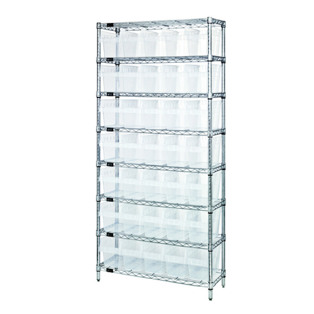The Quantum WR8-806CL Bin Wire Shelving System is a versatile and robust storage solution, measuring 36"W x 24"D x 74"H, designed to meet the diverse organizational needs across various industries. With an impressive weight capacity of 800 lb. per shelf, this system provides exceptional strength and durability, ideal for environments requiring reliable storage. It includes eight wire shelves, each capable of supporting substantial loads, and four sturdy posts that ensure stability. The inclusion of 35 QSB806 clear bins enhances visibility and accessibility, allowing for efficient sorting and retrieval of stored items. Its chrome plated finish not only adds an aesthetic appeal but also offers resistance to corrosion, thus extending the product's lifespan. This shelving system is particularly beneficial in industrial, commercial, and retail settings where space optimization and material handling are critical. Whether in a warehouse managing inventory, a workshop organizing tools and components, or a retail space displaying products, the Quantum WR8-806CL provides an adaptable and reliable storage solution. Its design facilitates modular expansion, accommodating varying spatial configurations and storage requirements. This system is engineered to deliver both functionality and efficiency, making it a valuable addition to any professional setting that demands robust and versatile storage capabilities.