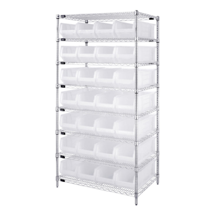 The Quantum WR8-950CL Bin Wire Shelving System is a versatile storage solution designed to meet diverse organizational needs across various industries. With an overall size of 36"W x 24"D x 74"H, this system efficiently maximizes storage space while maintaining accessibility. It features eight sturdy wire shelves, each capable of supporting up to 800 lbs, making it ideal for environments requiring robust storage capabilities, such as warehouses, retail, and industrial settings. The system includes four durable posts to ensure stability and strength, complemented by a chrome-plated finish that enhances both durability and aesthetic appeal. Additionally, the WR8-950CL includes 28 QUS950 clear bins, offering transparent storage that allows for easy identification of contents, thus enhancing efficiency in inventory management. This shelving system is engineered to provide a high-capacity storage solution that adapts to the needs of different market segments, whether it's for organizing materials in a manufacturing plant or displaying products in a retail setting. Its combination of heavy-duty shelving and clear bin storage makes it a practical and reliable choice for businesses aiming to optimize their storage space while maintaining order and accessibility.