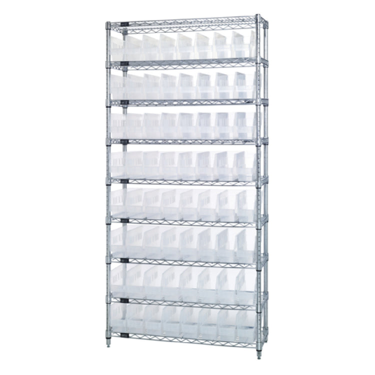 The Quantum WR9-201CL Bin Wire Shelving System is engineered for efficiency and versatility, embodying a robust storage solution with an overall size of 36"W x 12"D x 74"H. This shelving system boasts a substantial load-bearing capacity of 800 lb. per shelf, accommodating a wide range of storage needs across diverse industrial sectors. Constructed with nine durable wire shelves and supported by four sturdy posts, this system ensures stability and long-term use. The inclusion of 64 QSB201 clear bins enhances organizational capabilities, allowing for easy identification and retrieval of contents. The chrome-plated finish provides a sleek, professional appearance while offering corrosion resistance, making it suitable for demanding environments. This system is designed to meet the storage demands of various market segments, from warehousing and manufacturing to retail and laboratory settings, each benefiting from its comprehensive capacity and clear bin organization. The Quantum WR9-201CL maximizes spatial efficiency, making it an indispensable asset for enhancing workflow and productivity in both large and small-scale operations. Its precision-engineered design caters to the needs of businesses seeking a high-capacity, visually clear, and durable shelving solution that integrates seamlessly into their existing infrastructure.