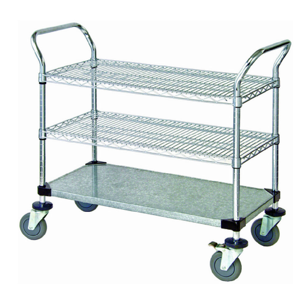 The Quantum WRC-1848-3CG Utility Cart is a versatile storage and transport solution, designed with precision to meet diverse industry needs. Measuring 48"W x 18"D x 37-1/2"H, this utility cart is equipped with two chrome-plated wire shelves, providing robust and adjustable storage options. Additionally, it features a galvanized solid shelf, enhancing its utility by offering a stable platform for various items. With a remarkable capacity of 1200 lbs, this cart is engineered to handle substantial loads, affirming its reliability in demanding environments. The open base design is complemented by two "U" shaped chrome plated handles, ensuring easy maneuverability. For enhanced mobility, the cart is supported by four 5" polyurethane swivel casters, two of which are equipped with brakes for secure positioning. The inclusion of donut bumpers further protects against impacts, safeguarding both the cart and surrounding objects. Certified by NSF, this utility cart meets rigorous public health and safety standards, making it an ideal choice for healthcare, hospitality, and food service industries. The thoughtful design and robust construction make the Quantum WRC-1848-3CG Utility Cart an essential asset for professionals seeking efficient and reliable material handling solutions.