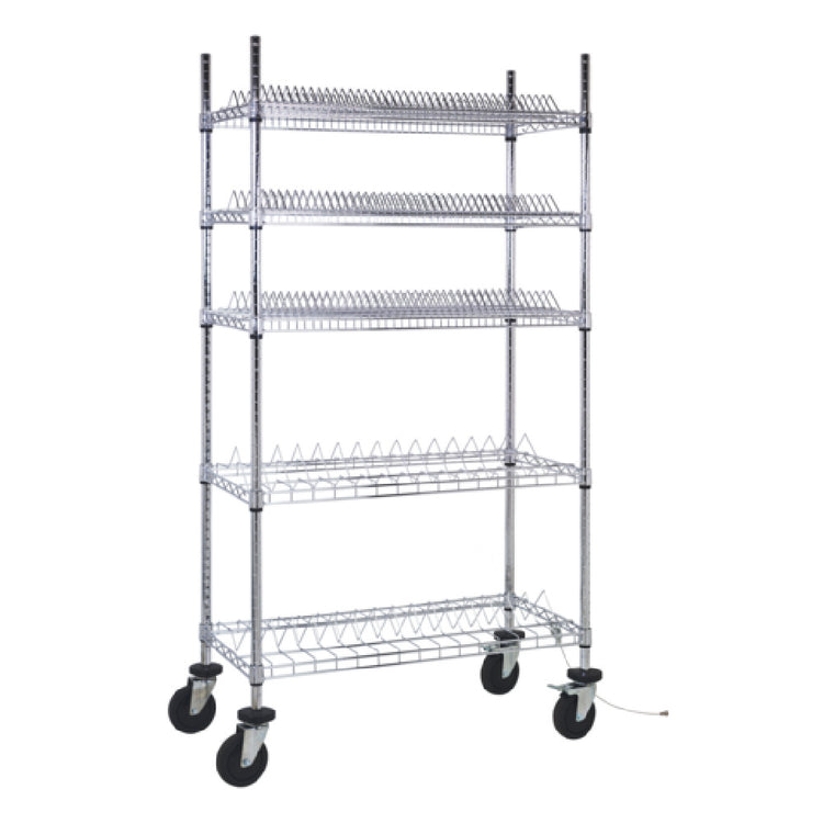 The Quantum WRC-R264C Reel Shelving Cart is a versatile storage solution measuring 36 inches in width, 18 inches in depth, and 69 inches in height. Designed with functionality and durability in mind, this cart includes a total of five wire shelves, segmented into two 15-reel shelves and three 78-reel shelves, providing ample capacity for various storage needs. It features four conductive swivel casters, two of which are equipped with brakes, ensuring both mobility and stability in industrial environments. These casters are complemented by a drag chain for added safety. The cart's chrome-plated finish not only enhances its aesthetic appeal but also ensures long-lasting durability. This product is particularly beneficial for industries requiring efficient storage and organization of reels, wires, or similar components, as its robust construction and flexible mobility cater to demanding operational settings. Its thoughtful engineering allows for optimal storage solutions in environments where space efficiency and ease of access are crucial. The Quantum WRC-R264C is an invaluable asset across multiple industry segments, providing a practical and reliable option for those needing a robust shelving system that balances capacity with maneuverability.