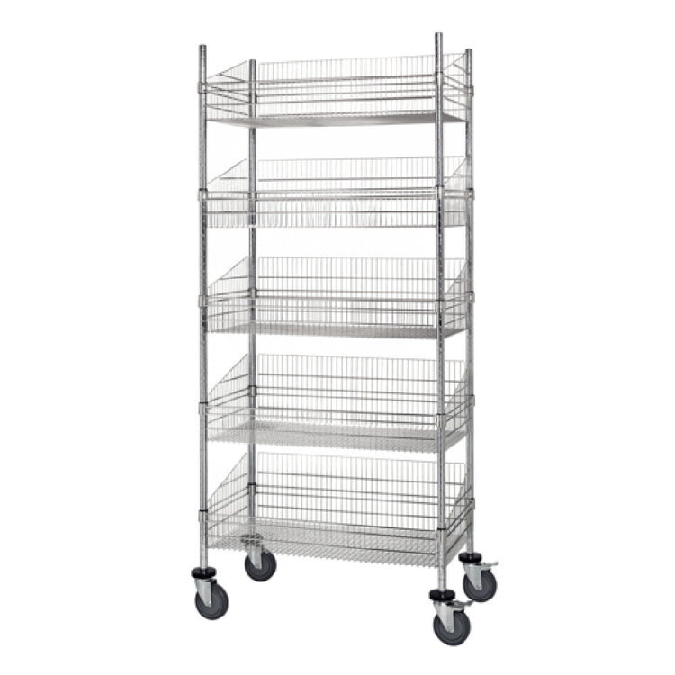 The Quantum WRC74-BSK2436C-5 Post Basket Cart, measuring 36 inches in width, 24 inches in depth, and 80 inches in height, is a robust and versatile storage solution with a substantial load capacity of 1200 lbs. This cart is designed with five spacious baskets, providing ample storage for various items, making it ideal for diverse commercial and industrial applications. The chrome-plated finish not only enhances its aesthetic appeal but also ensures durability and corrosion resistance, making it suitable for environments where hygiene and cleanliness are paramount. Shipped in a knocked-down (KD) form, this cart is easily assembled, allowing for convenient transportation and handling. The Quantum WRC74-BSK2436C-5 is particularly beneficial for sectors such as warehouses, retail, and healthcare, where efficient organization and mobility are critical. Its generous dimensions and sturdy construction make it capable of supporting heavy loads, while the basket design allows for easy access and visibility of stored items. This cart's ability to blend functionality with durability makes it a valuable asset for any organization looking to optimize their storage solutions while maintaining a high standard of operational efficiency.