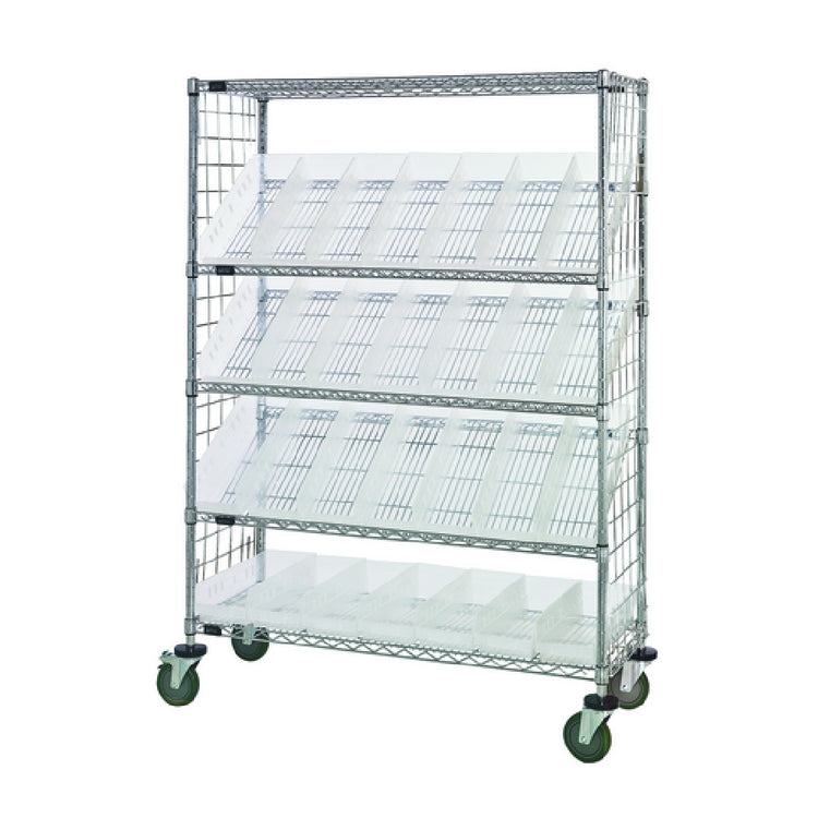 The Quantum WRCSL5-63-2436EP-106CL Slanted Shelf Enclosure Cart stands as a versatile solution for efficient storage and organization. Measuring 36 inches in width, 24 inches in depth, and 69 inches in height, this cart is designed to accommodate a load capacity of up to 1200 lbs. It features a combination of two flat and three slanted shelves, providing flexibility for various storage needs. The cart comes equipped with 20 QSB106 clear bins, which enhance visibility and accessibility of stored items. Side enclosure panels ensure that contents are securely held in place. The chrome-plated finish not only adds a sleek appearance but also offers durability and resistance to wear. The unit is shipped in a KD (knocked down) form, which may simplify transportation and storage before assembly. This slanted shelf enclosure cart is particularly beneficial in environments that require organized inventory management, such as warehouses, workshops, and industrial settings. Its robust design and strategic features cater to the diverse requirements of different market segments, making it a practical asset for businesses seeking reliable storage solutions.