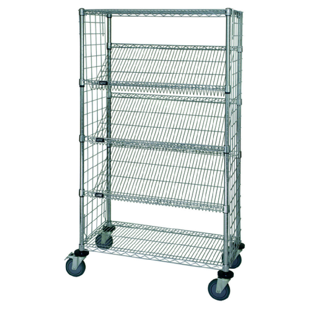 The Quantum WRCSL5-63-2436EP Slanted Shelf Enclosure Cart is a highly versatile and robust storage solution designed for industrial and commercial environments. With dimensions of 36"W x 24"D x 69"H, this cart offers ample space while maintaining a compact footprint. The unique design includes two flat shelves and three slanted shelves, providing diversified storage options to accommodate various materials and tools. The cart's 1200 lbs. load capacity ensures it can support a significant weight, making it suitable for heavy-duty applications. The inclusion of side enclosure panels enhances security and helps to prevent items from falling, adding an extra layer of protection for stored goods. Its chrome-plated finish not only adds to its durability but also gives it a sleek, professional appearance, which is easy to integrate into any workspace. Shipped KD (knocked down), the cart is designed for easy assembly, ensuring efficient setup and use. This enclosure cart is particularly useful in warehouses, manufacturing plants, and maintenance facilities that require reliable and versatile material handling solutions, capable of supporting substantial loads and offering flexible storage configurations to meet diverse operational demands.
