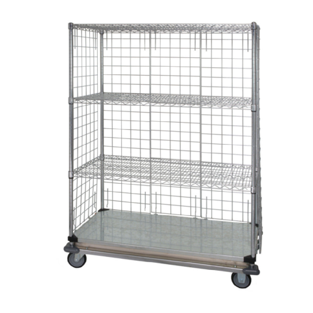 The Quantum WRDBS4-63-2436EP Wire Enclosed Cart Mobile stands out with its mobile design and robust construction, making it an essential asset for various industry segments that require efficient storage and transport solutions. Measuring 36 inches in width, 24 inches in depth, and 69 inches in height, it provides ample space while maintaining a compact footprint, ensuring ease of movement through tight spaces. This cart boasts a substantial 1200 lb. capacity, suitable for heavy-duty applications. It includes three wire shelves and one solid galvanized steel shelf, offering flexibility in storage configurations. The four 63-inch-high posts and enclosure panels enhance its structural integrity and safeguard the contents. Equipped with a dolly base, this cart ensures stability and ease of mobility, supported by four plate thermoplastic resin casters - two rigid and two swivel with brakes, which provide reliable maneuverability and secure positioning. The chrome plated finish not only adds a layer of protection against corrosion but also delivers a sleek, professional appearance. The Quantum WRDBS4-63-2436EP Wire Enclosed Cart Mobile is a versatile solution, adept at meeting the needs of environments that require organized and secure handling of goods, including warehouses, commercial kitchens, and medical facilities.