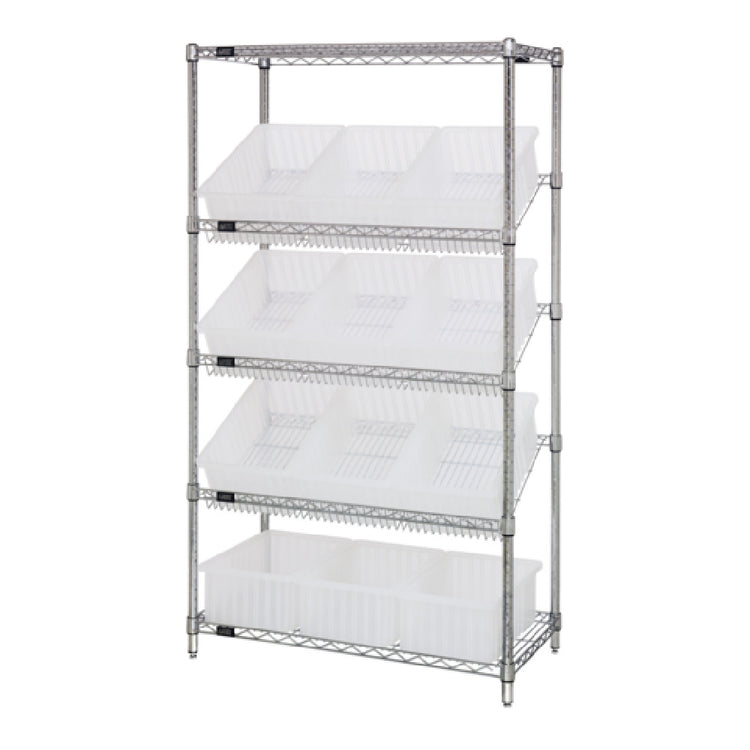 The Quantum WRS-5-92060CL Bin Systems Unit Stationary 36"W X 18"D X 63"H is a comprehensive storage solution, expertly designed for efficiency and organization. This unit stands at an impressive 63 inches in height, with a width of 36 inches and a depth of 18 inches, providing ample space to accommodate various storage needs. It comes with two flat wire shelves and three slanted wire shelves, which allow for versatile arrangements tailored to specific requirements. The system also includes four posts and twelve clear bins measuring 16-1/2"W x 10-7/8"D x 6"H each, facilitating easy categorization and quick retrieval of stored items. The bins' transparency aids in rapid identification of contents, enhancing operational efficiency. A chrome-plated finish not only adds a sleek aesthetic but also ensures durability and resistance to corrosion, making it suitable for various industrial environments. This unit is NSF certified, marking its adherence to public health standards, and is shipped in a knocked-down (KD) format, meaning it is disassembled for easier transport and on-site assembly. The Quantum WRS-5-92060CL is an ideal choice for diverse market segments seeking organized, reliable, and space-efficient storage solutions within the storage and organizational industry.