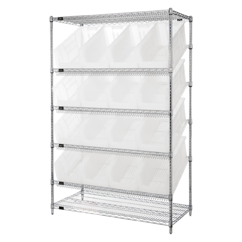The Quantum WRSL6-74-2448-953CL Bin System Unit Stationary is a meticulously designed storage solution tailored for various industry segments requiring efficient organization and space management. Measuring 24 inches in width, 48 inches in length, and 74 inches in height, this unit provides substantial storage capacity with a robust 800 lbs. capacity per shelf. Its configuration includes two flat and four slanted shelves, offering versatile storage arrangements to accommodate different types of items. The unit comes equipped with four posts that ensure stability and integrity. Additionally, it is outfitted with 16 QUS953 clear bins, enabling easy visibility and access to stored contents. The chrome-plated finish not only enhances the unit's durability but also provides a sleek aesthetic appeal suitable for modern industrial environments. Shipped in a knocked-down form (KD), it facilitates easy transportation and assembly on site. This bin system unit is an invaluable asset for businesses looking to streamline their storage needs with a reliable and durable solution. The Quantum WRSL6-74-2448-953CL stands out in its ability to offer customizable organization solutions for warehouses, retail, and any settings where efficient storage and quick access to items are paramount.