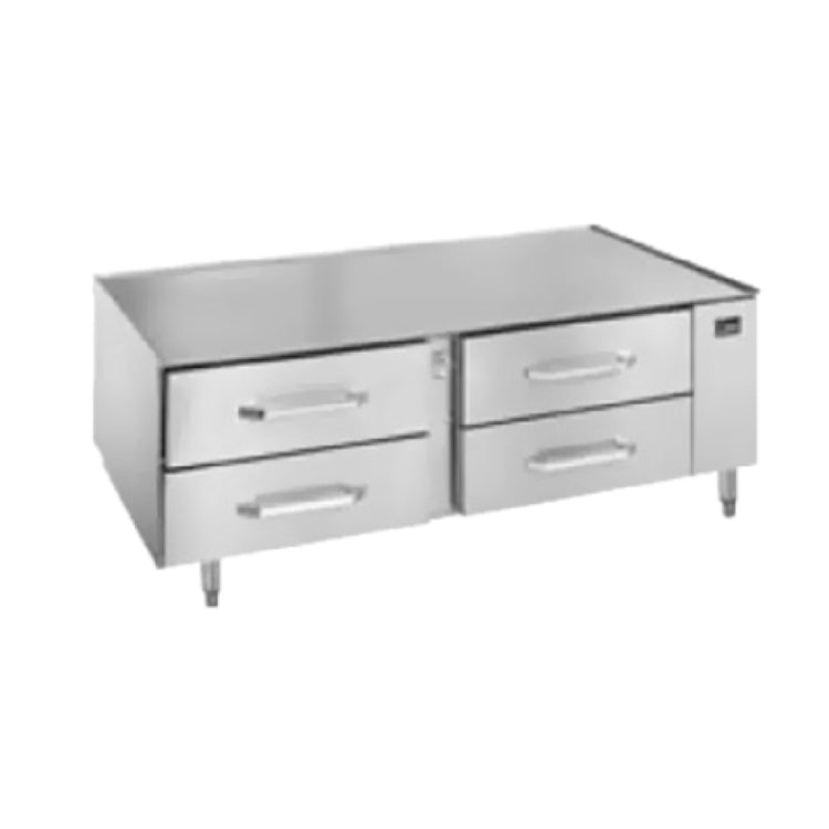 The Randell 20065R Refrigerated Counter/Equipment Stand is a highly efficient two-section unit designed for commercial kitchens requiring robust and versatile refrigeration solutions. Measuring 65 inches in length, this equipment stand is distinguished by its remote refrigeration system, which allows for flexible kitchen layouts. The unit features four 27-inch drawers, each capable of housing two 12-inch by 20-inch by 4-inch deep pans, although the pans themselves are not included. Its construction boasts a reinforced stainless steel marine top, complemented by a durable 12-gauge subtop for enhanced stability and resilience. The stainless steel drawer fronts and sides ensure longevity and ease of cleaning, catering to the high standards demanded by professional foodservice environments. The stand is supported by 6-inch adjustable legs, providing stability on uneven surfaces and accommodating varied operational needs. Importantly, the Randell 20065R is designed without an integrated compressor, which allows users to connect it to an existing remote refrigeration system, offering increased efficiency and reduced noise. This equipment stand is an ideal choice for kitchens looking to optimize space while maintaining rigorous temperature control for food safety and quality.