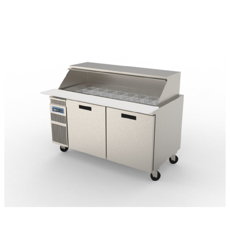 The Randell 9260W-290 High Heat Refrigerated Mega-Top Sandwich Unit / Breading Table is a versatile and efficient solution for commercial kitchens, specifically designed to cater to high-demand sandwich preparation and breading needs. This two-section unit measures 60 inches in width and offers a substantial 9.8 cubic feet of storage capacity. It features a side-mounted, self-contained refrigeration system, ensuring optimal cooling performance. The stainless steel top is designed with openings for twenty-four 1/6 size pans (not included), providing extensive storage for sandwich ingredients. This model includes two solid hinged doors and a 10-inch poly cutting board, enhancing its practicality and usability. Equipped with independent electronic controls and a mega-top cold wall refrigeration pan rail, this unit ensures precise temperature management, critical for maintaining food safety and quality. The construction features a stainless steel front and sides, with an interior made of aluminum and ABS, ensuring durability and ease of cleaning. Utilizing R290 Hydrocarbon refrigerant and powered by a 1/3 HP motor, the Randell 9260W-290 is an environmentally friendly choice. Certified by NSF 7, cUL, and UL, and proudly made in the USA, this unit is an excellent investment for establishments prioritizing efficiency, quality, and sustainability in food preparation operations.