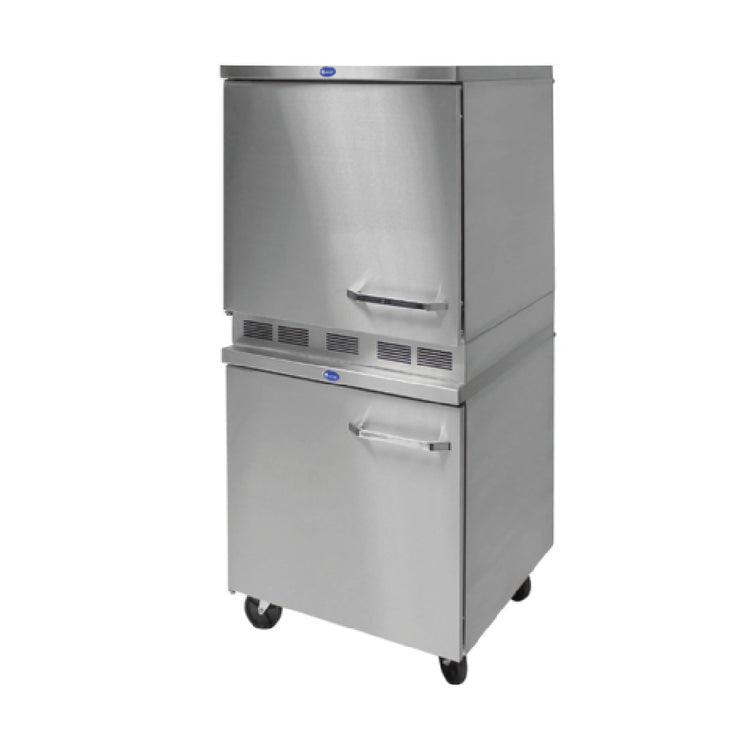 The Randell 9404-27DT-RBFTR Dual Temp Refrigerator/Freezer Reach-in One-section is an innovative solution tailored for diverse commercial food storage needs. This unit features two compartments with a combined capacity of 5.66 cubic feet for both refrigerator (bottom) and freezer (top) sections. The design includes two half-height stainless steel doors hinged on the right, providing easy access to stored items while maintaining energy efficiency. Inside, the unit offers two adjustable shelves for customizable storage options. Engineered with electronic controls, it ensures precise temperature management. The self-contained refrigeration system incorporates defrost functionality and a removable condensate drip pan for easy maintenance. Constructed with a durable stainless steel front and sides, and an aluminum interior, this appliance is designed for durability and hygiene. Mobility is enhanced with 6-inch casters, ensuring easy repositioning within your workspace. The unit utilizes R290 Hydrocarbon refrigerant and is powered by two 1/4 HP compressors, operating at 2.2 amps with a 115v/60/1 electrical requirement, suitable for standard electrical outlets with two NEMA 5-15P plugs. It meets cUL, UL, and NSF standards, and is proudly made in the USA, making it a reliable choice for restaurants, catering businesses, and other food service operations.