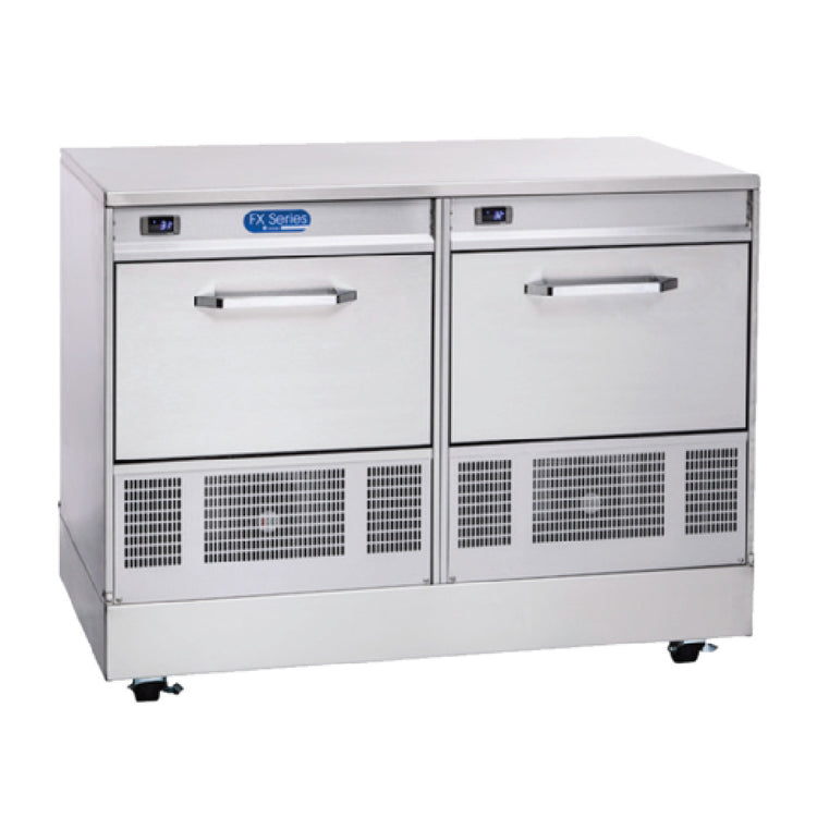 The Randell FX-2UCB-290 FX Series Beverage/Ice Cream Cooler is a versatile cooling solution tailored for various market segments such as restaurants, cafes, and retail establishments needing precise temperature control for their perishable goods. With a 54-inch width and a 5.66 cubic feet storage capacity, this cooler is designed to maximize space without sacrificing functionality. It features two drawers that allow for easy organization and access to stored items. The standout attribute of this cooler is its convertible refrigeration system, which adjusts temperatures from -5° F, suitable for freezing, up to 40° F, making it equally adept as a refrigerator. This flexibility is enhanced by a front-breathing design, ideal for confined spaces. Constructed with a stainless steel interior, exterior, and base, the cooler promises durability and a sleek appearance. It includes 6-inch locking front casters for stability and mobility, and chrome handles for a modern touch. Utilizing R290 Hydrocarbon refrigerant, it supports environmentally friendly operation. Powered by two 1/4 HP compressors, the unit is UL, cUL, and NSF certified, ensuring compliance with safety and health standards. Proudly made in the USA, the Randell FX-2UCB-290 stands out as a reliable and efficient cooling unit for diverse commercial needs.