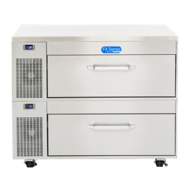 The Randell FX-2WS-290 FX Series Flexible Refrigerator or Freezer Work Table is a versatile and efficient solution for commercial kitchens, designed with a width of 43.03 inches and a storage capacity of 6.2 cubic feet. This dual-purpose unit is equipped with two drawers featuring removable ABS inserts, catering to a variety of storage needs. It includes two self-contained refrigeration systems with precise electronic controls, maintaining temperatures of 40 degrees Fahrenheit for refrigeration and -5 degrees Fahrenheit for freezing. The unit features a finished top, enhancing its utility as a work surface, and boasts a durable stainless steel exterior and interior for improved longevity and cleanliness. Mobility and versatility are further enhanced by the 3-1/2 inch casters. Utilizing R290 Hydrocarbon refrigerant and powered by two 1/4 HP compressors, this work table is both environmentally friendly and highly efficient. Certified by UL, NSF, and cUL, and made in the USA, the Randell FX-2WS-290 stands out for its quality and reliability, making it an ideal choice for food service operations seeking a reliable, flexible refrigeration solution.