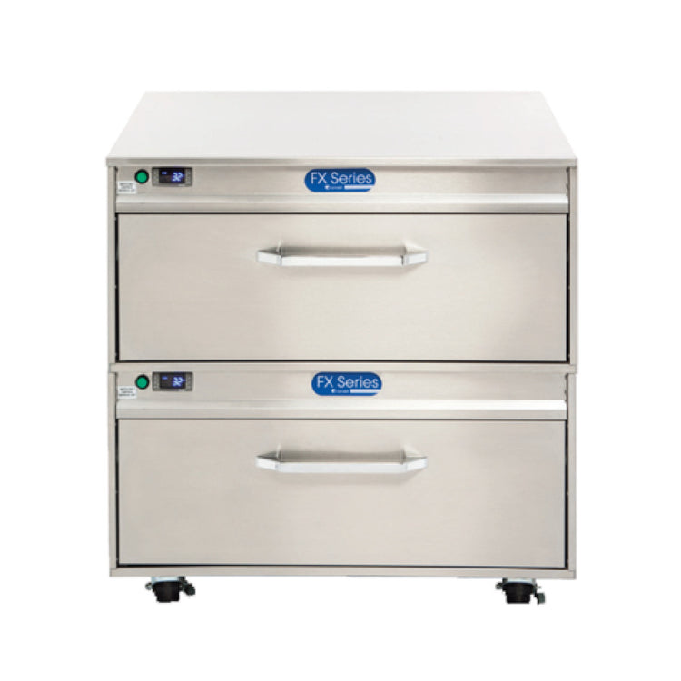 The Randell FX-2WSRE-290 FX Series Flexible Refrigerator or Freezer Work Top 35" W is a highly versatile refrigeration solution for diverse commercial kitchen settings. With a width of 35 inches and offering 6.2 cubic feet of storage, it is designed for both refrigeration and freezing needs, featuring two self-contained refrigeration systems with precise electronic controls. The refrigerator maintains a temperature of 40°F, while the freezer operates at -5°F, providing flexibility for various storage requirements. Its stainless steel exterior enhances durability and aesthetics, making it suitable for high-demand environments. The unit includes two drawers for organized storage, and it is mounted on 3-1/2 inch casters, ensuring easy mobility. Engineered with R290 Hydrocarbon refrigerant and powered by two 1/4 HP compressors, it is both efficient and eco-friendly. Certified by UL, cUL, and NSF, this work top adheres to rigorous safety and sanitation standards. Proudly made in the USA, the Randell FX-2WSRE-290 is an excellent choice for businesses seeking reliable and flexible refrigeration solutions, whether in restaurants, catering services, or other foodservice operations, providing unparalleled convenience and adaptability in one robust unit.