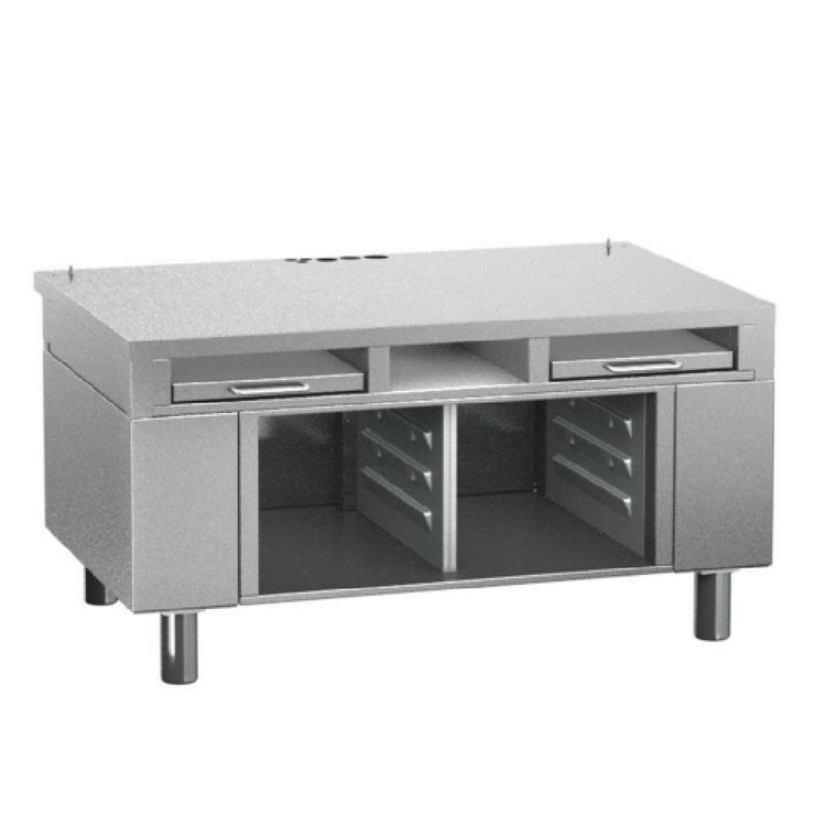 The Rational 60-31-326 Stand is a versatile piece designed to meet the demands of diverse kitchen environments, with dimensions of 43-1/4" in width and 28-1/8" in depth. It features an adjustable height ranging from 22-3/8" to 30-1/4", making it adaptable for various operational needs. This stand includes two pull-out shelves and two sets of rails specifically designed for 12" x 20" pans, offering ample storage and organizational capabilities. The inclusion of top and side panels enhances its structural integrity and aesthetic appeal. Notably, the stand is equipped with electric height-adjustable feet, which can extend by 7-7/8", providing additional flexibility in height adjustment. This makes it suitable for a wide range of professional kitchens, particularly those requiring customizable solutions. Tailored for the size 2-XS category, this stand is engineered to support efficient workflow in food preparation areas. Its robust construction and practical features make it an indispensable component for chefs and kitchen staff, ensuring seamless integration and enhanced operational efficiency. Leveraging its technical specifications, the Rational 60-31-326 Stand is an excellent choice for establishments looking to optimize their kitchen workspace with precision and reliability.