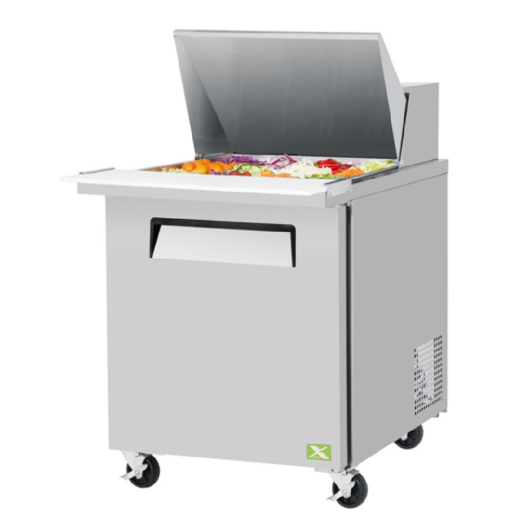 Refrigeration X, XST-28-12-N6, Refrigeration X, Sandwich/Salad Mega Top Unit, one section, 27-1/2"W x 34"D x 39-5/8"H, 10.16 cu. ft., (1) solid door, (1) adjustable PE coated wire shelf, (12) 1/6 size x 4" deep pan capacity, (1) hood, cold air compartment, 9-1/2" deep cutting board with side rail, stainless steel exterior door, aluminum exterior side (galvanized steel back & bottom), rear-mount self-contained compressor, R-600a Hydrocarbon refrigerant, 1/5 HP, 115v/60/1-ph, 2.5 amps, NEMA 5-15P, cETLus, ETL-Sanitation