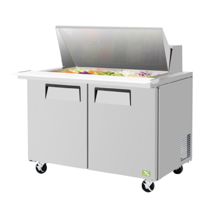 Refrigeration X, XST-48-18-N, Refrigeration X, Sandwich/Salad Mega Top Unit, two section, 48-1/4"W x 34"D x 39-5/8"H, 17.82 cu. ft., (2) solid doors, (2) adjustable PE coated wire shelves, (18) 1/6 size x 4" deep pan capacity, (1) hood, cold air compartment, 9-1/2" deep cutting board with side rail, stainless steel exterior door, aluminum exterior side (galvanized steel back & bottom), rear-mount self-contained compressor, R290 Hydrocarbon refrigerant, 1/3 HP, 115v/60/1-ph, 3 amps, NEMA 5-15P, cETLus, ETL-Sanitation