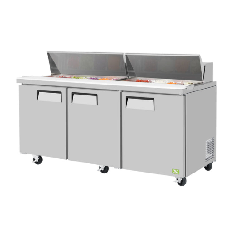 Refrigeration X, XST-72-N, Refrigeration X, Sandwich/Salad Unit, three section, 72-3/4"W x 30"D x 37-1/2"H, 19 cu. ft., (3) solid doors, (3) adjustable PE coated wire shelves, (18) 1/6 size x 4" deep pan capacity, (2) hood, cold air compartment, 9-1/2" deep cutting board with side rail, stainless steel exterior door, aluminum exterior side (galvanized steel back & bottom), rear-mount self-contained compressor, R290 Hydrocarbon refrigerant, 3/8 HP, 115v/60/1-ph, 5.5 amps, NEMA 5-15P, cETLus, ETL-Sanitation