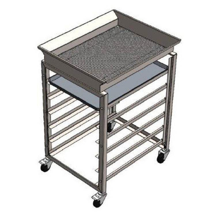 Resfab Equipment, TD-6P, Dump Table, floor model, mobile, removable dump tray, (6) sets of tray slides, includes (1) full sized sheet pan & (1) grate, stainless steel frame, (4) casters (2 with locks).