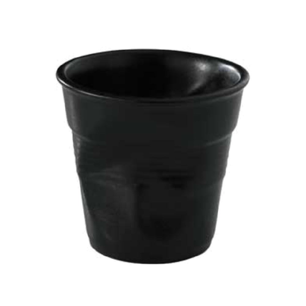 Revol 1640 (RGO0108) Espresso Tumbler 2-3/4 Oz. 2-1/2" Dia. x 2-1/4"H is an elegantly designed piece crafted by Revol USA, a notable name in the industry. This crumpled, round espresso tumbler is meticulously constructed from high-quality porcelain, ensuring durability and sophistication. The tumbler features a satin black finish, adding a touch of modern elegance to any setting. It is oven, microwave, freeze, and dishwasher safe, providing versatility and convenience for different uses in the culinary sector. With a capacity of 2-3/4 ounces, this tumbler is perfect for serving espresso and other beverages, making it an essential item for cafes, restaurants, and home baristas. Standing at a height of 2-1/4 inches with a diameter of 2-1/2 inches, its compact size is ideal for easy handling and storage. Part of the Froisses collection, this product is a US stocked item and comes packed with six per case, ensuring efficient inventory management for businesses of varying scales. The Revol 1640 Espresso Tumbler combines aesthetic appeal with functional practicality, making it a valuable addition for establishments seeking to enhance their beverage presentation.