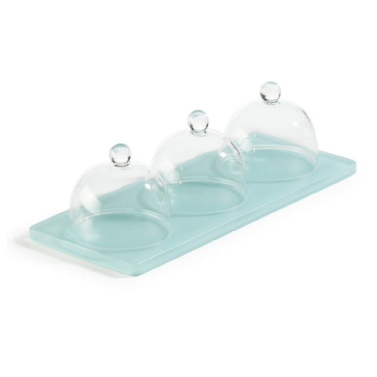 The Revol 411649 Cloche & Base Set is a meticulously crafted piece, designed and made in France, that caters to the diverse needs of the culinary industry. Measuring 9-3/4 inches in width, 3-1/2 inches in depth, and 3 inches in height, this rectangular set is as aesthetically pleasing as it is functional. It includes three cloches and a Nacryl® resin base, ensuring a sleek and durable surface that is both food safe and non-porous. The cloche and base set is notable for its shockproof qualities and remarkable thermal shock resistance, tolerating temperatures from -148°F to +176°F. This makes it an excellent choice for both hot and cold presentations. It is dishwasher safe, offering convenience for busy kitchens. The elegant lagoon color adds a touch of sophistication to any setting. Packaged with six sets per case, the Revol 411649 is a perfect fit for restaurateurs and chefs seeking reliable, high-quality serveware with an edge in thermal durability and stylish design.