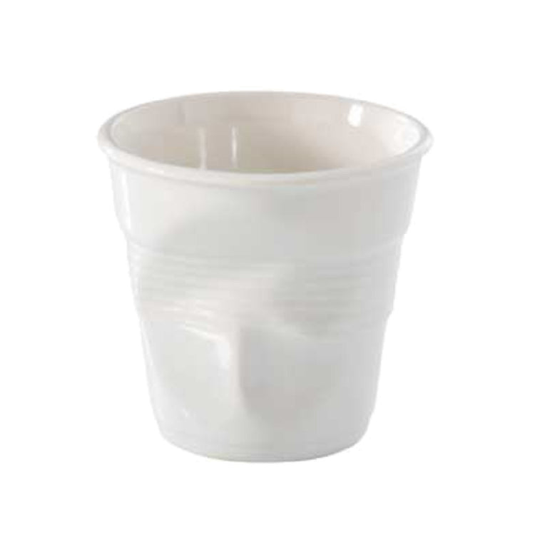 The Revol 616096 (RGO0108) Espresso Tumbler is a meticulously designed porcelain cup that caters to connoisseurs of fine dining and beverage service. With a compact volume of 2-3/4 oz., this tumbler is aptly sized for serving rich, aromatic espressos. The dimensions—2-1/2" in diameter and 2-1/4" in height—highlight its round, crumpled aesthetic, which adds a touch of modern elegance to any setting. Crafted from high-quality porcelain, the Revol 616096 tumbler ensures durability and resilience, making it suitable for both casual and upscale environments. Its practical design allows for versatile use across various service settings, as it is oven, microwave, freezer, and dishwasher safe. This versatility is particularly beneficial for establishments that require efficient kitchen operations, including cafes, restaurants, and catering services. The tumbler's pristine white finish enhances its visual appeal, complementing a variety of tableware styles. Stocked under the Froisses collection in the USA, the product is readily available to meet immediate needs, packaged securely with six pieces per case. The Revol 616096 Espresso Tumbler stands as a testament to refined craftsmanship, offering a unique blend of functionality and style for diverse market segments in the hospitality industry.