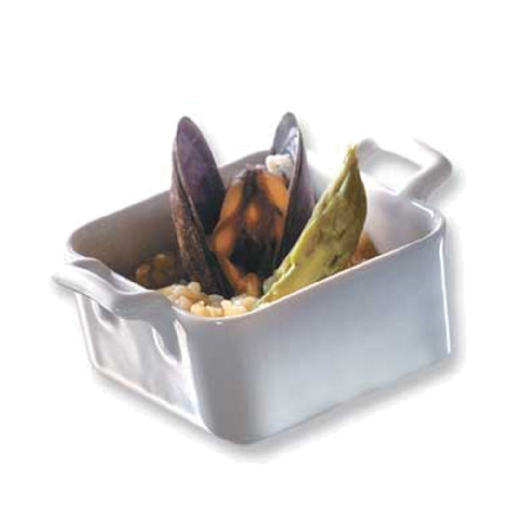 The Revol 636148 (BC1207) Mini Dish is a meticulously crafted porcelain dish with a capacity of 2-3/4 oz., measuring 2-3/4" x 2-3/4" x 1-1/2"H, making it an ideal choice for both personal and professional culinary applications. This square dish comes with handles, enhancing its practicality in various kitchen settings. Its deep design is suitable for a range of culinary presentations, offering versatility in serving small portions or appetizers in a visually appealing manner. The dish's ability to withstand oven, microwave, freezer, and dishwasher conditions underscores its durability and adaptability in diverse cooking and serving environments. The white, glazed finish not only adds an aesthetic touch but also ensures easy cleaning and maintenance. As a part of the Belle Cuisine line, this US-stocked item is packed in cases of six, catering to the needs of restaurants, caterers, and home kitchens alike. The Revol 636148 Mini Dish combines functionality and elegance, representing a valuable asset for those seeking to enhance their dining presentations with a reliable and stylish serving solution.