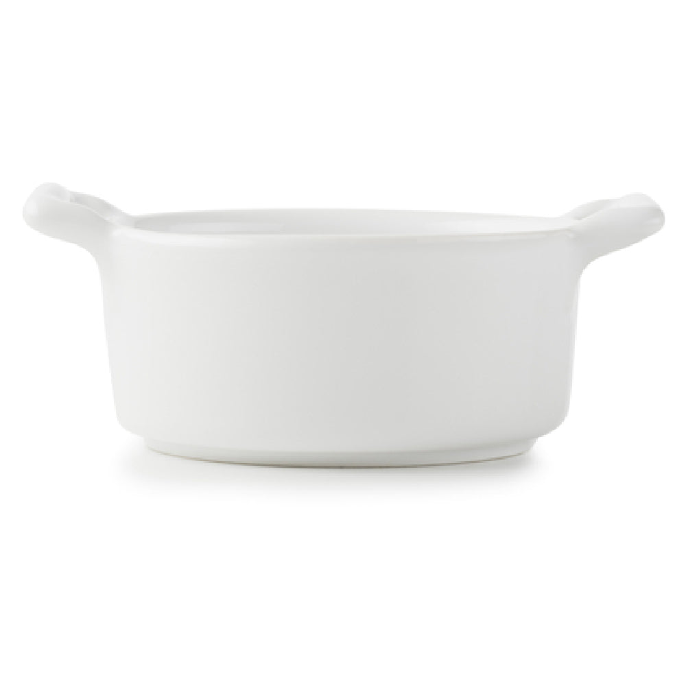 The Revol 639256 (BC0108CO-1) Mini Cocotte is a versatile and elegant kitchen staple, measuring 3 inches by 2-3/4 inches by 1-1/2 inches in height. This oval mini cocotte, crafted without a lid, features convenient handles for ease of use. It is made from high-quality glazed porcelain in a classic white finish, ensuring both aesthetic appeal and durability. Designed to meet diverse culinary needs, this mini cocotte is safe for use in the oven, microwave, freezer, and dishwasher, offering flexibility and convenience for both home cooks and professional chefs. With a capacity of 2-3/4 ounces, it is perfect for serving individual portions or small side dishes, making it an ideal choice for upscale restaurants, catering services, or intimate home dining experiences. Part of the Belle Cuisine collection, this product is packed in cases of six, allowing for efficient storage and handling. The Revol 639256 Mini Cocotte seamlessly combines functionality with style, adding a touch of sophistication to any dining presentation while ensuring reliable performance across various cooking environments. Shipped directly from France, this mini cocotte embodies the refined craftsmanship and quality synonymous with Revol's esteemed kitchenware range.