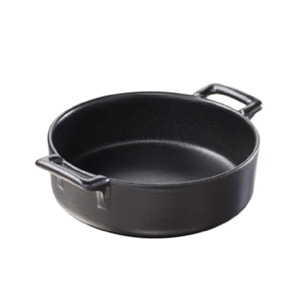 The Revol 644665 (BC0912N) Starter/Dessert Dish (SHIPS FROM FRANCE) - 10-1/4 Oz. is an exemplary piece of kitchenware designed to meet various culinary needs with its exceptional versatility and elegant design. Measuring at a 4-3/4" diameter and standing 2" tall, this round, shallow dish features convenient handles for easy maneuverability. Crafted in a sophisticated cast iron style, the dish is constructed from high-quality porcelain with a glossy black glazed finish, ensuring both durability and an attractive presentation. This dish is compatible with multiple cooking and storage environments, being oven, microwave, freezer, and dishwasher safe, which provides seamless integration into diverse kitchen settings. Belonging to the Belle Cuisine collection, and packed as four per case, this dish is designed to enhance the dining experience by effectively showcasing starters and desserts. Its unique design and functionality make it suitable for both professional chefs and home cooks seeking a versatile and reliable serving dish that exudes understated elegance. The Revol 644665 dish is a truly unique addition to any culinary toolkit, offering reliability and style shipped directly from France, ensuring an authentic European touch to your dining presentation.
