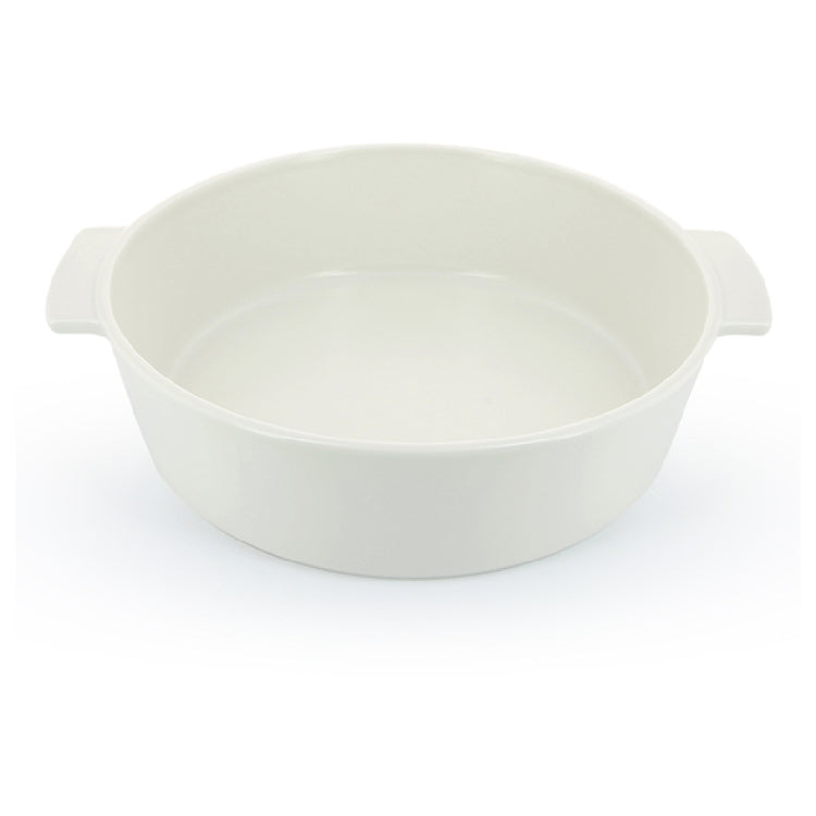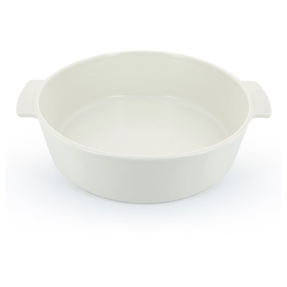 The Revol 649866 (RVLT2) Cocotte is a meticulously crafted cooking vessel with a generous capacity of 127 oz., designed to meet the needs of diverse culinary environments. Measuring 11" in diameter and 3-1/4" in height, this round cocotte features a shallow design with convenient handles, making it ideal for both preparation and presentation. This model is induction ready and versatile, being safe for use in ovens, freezers, and dishwashers, which enhances its practicality in various kitchen operations. The microwave-safe body further underscores its adaptability, providing seamless transitions between cooking methods. Crafted from non-porous ceramic, the cocotte ensures optimal hygiene and durability, while the satin white finish adds a touch of elegance to any kitchen setting. As part of the Revolution 2 series, which was previously known as 643845, this cocotte represents a blend of innovation and tradition, shipped directly from France. It is sold individually, making it a distinct addition to any culinary toolkit. The Revol 649866 (RVLT2) Cocotte is an exemplary choice for chefs and home cooks alike, delivering a reliable and aesthetically pleasing solution for a range of cooking tasks.