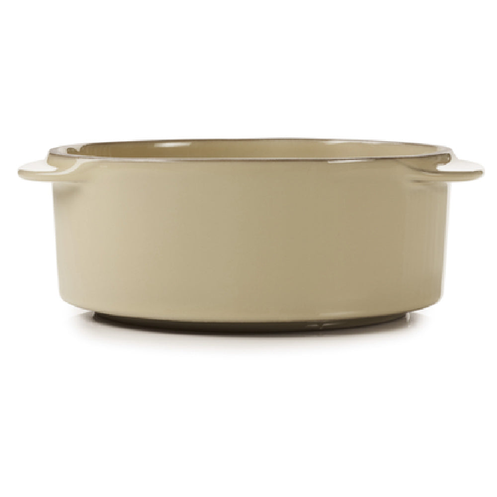 The Revol 654816 (4A+CO2412CON-201) Cocotte stands out as a versatile piece in the culinary world, designed to meet the diverse needs of chefs and home cooks alike. With a capacity of 8.75 oz., this cocotte is perfect for individual servings or small dishes. Its dimensions, 4-3/4 inches in diameter and 2 inches in height, provide a compact yet functional design. Crafted from porcelain and finished in a nutmeg hue, it brings a touch of elegance to any table setting. This round cocotte is equipped with convenient handles, ensuring easy transport from oven to table. As an oven, microwave, freezer, and dishwasher-safe item, it offers unmatched convenience in preparation, storage, and cleaning processes. Part of the Caractere collection and available as a US stocked item, the cocotte is packed four each per case. Its practical design is especially suited for restaurants and food service establishments seeking reliable, high-quality cookware that seamlessly transitions from kitchen to dining area. The Revol 654816 cocotte embodies a blend of style and functionality, making it a valuable addition for those in the culinary industry who prioritize both aesthetics and performance in their kitchenware selections.