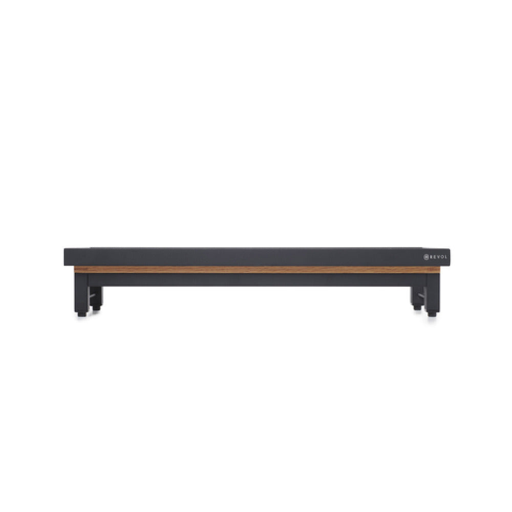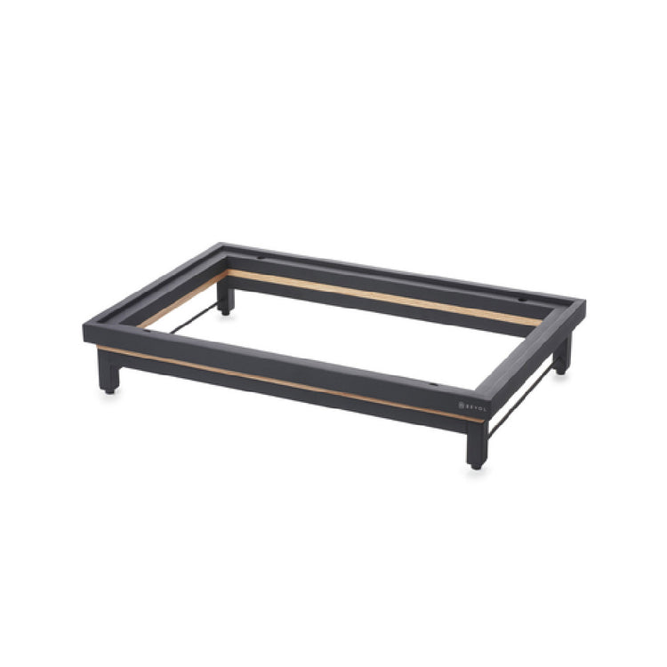 The Revol 656039 Riser 22-1/4"W X 14"D X 4"H High For GN 1/1 is a sophisticated and functional fixture designed to enhance presentations in culinary and hospitality settings. Measuring 22-1/4 inches in width, 14 inches in depth, and 4 inches in height, this riser provides a substantial platform for showcasing gastronomic creations. Constructed with a matt black metal surface, it ensures durability and a sleek aesthetic that complements various environments. The oak frame adds a touch of elegance and natural warmth, making it an attractive addition to buffets, catering events, or restaurant displays. Specifically designed for compatibility with GN 1/1 specifications, this riser integrates seamlessly with industry-standard gastronorm containers, enhancing its utility for chefs and catering professionals. Its robust construction supports a wide range of culinary applications, from displaying appetizers to serving as a focal point in food presentations. The Revol 656039 Riser is packed individually, ensuring that it arrives in pristine condition, ready to elevate the visual appeal of any dining experience. This product is a testament to Revol's commitment to quality and design, offering a versatile solution for professionals seeking to enhance their service presentation with a reliable and stylish accessory.