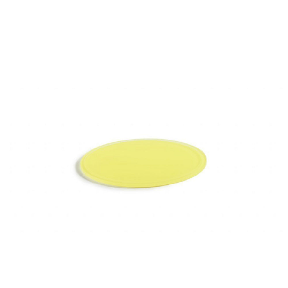 The Revol 656273 Tray (SHIPS FROM FRANCE) with Groove for Dome is a meticulously engineered product, featuring a round design that excels in both functionality and aesthetic appeal. This tray is stackable, providing an efficient storage solution ideal for busy kitchen environments. Crafted from Nacryl® resin, it is shockproof and thermal shock resistant, able to withstand temperatures ranging from -148°F to +176°F. Its non-porous surface ensures it is food safe and it is conveniently dishwasher safe, making it a practical choice for culinary professionals. Manufactured in France, the tray is adorned in a vibrant lemon hue, adding a touch of elegance to any setting. The groove for the dome adds an additional layer of utility, catering to the specific needs of high-end food presentations. Its durability and design make it a standout option for chefs and catering businesses looking for high-quality, reliable serveware. The Revol 656273 Tray merges innovation with tradition, offering a unique solution to those in the food service industry seeking both performance and style.